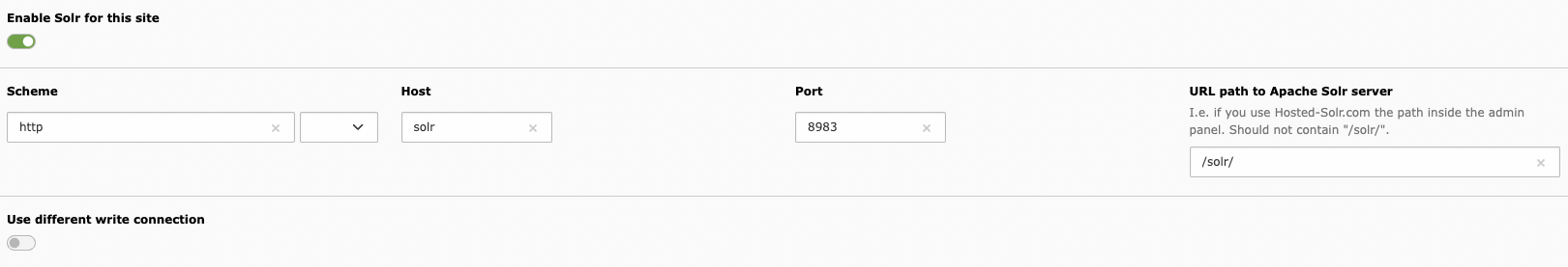Administrators can configure the solr connection in the site module. This section defines the address of the Solr server.