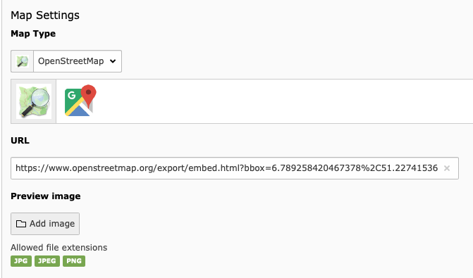 After that you have to choose which type you want to use (OpenStreetMaps or Google Maps) and add the URL to the map. See below how to get the map url.