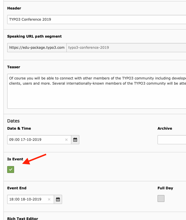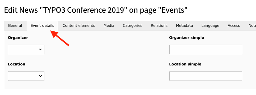 By activiting the property “Is event”, you can transform a news record into an event record.